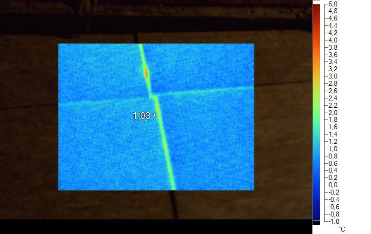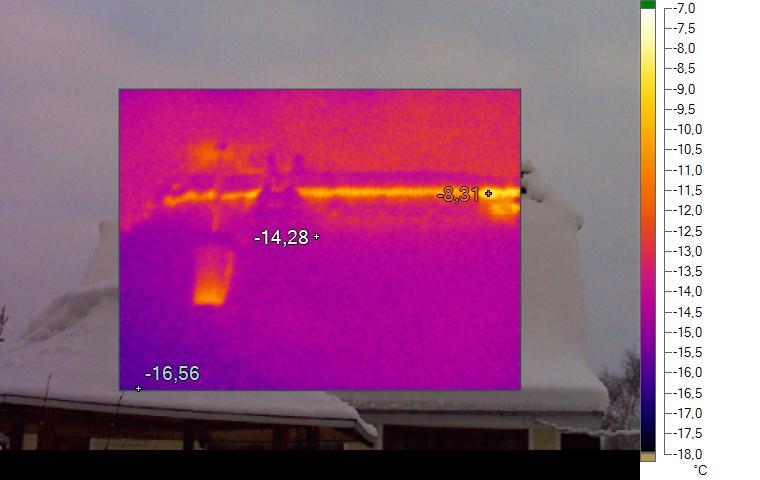 Фото сделанное тепловизором иллюстрирует другую распространенную проблему, связанную с минватой — это постепенное сползание минваты, потеря формы, что приводит к интенсивной потере тепла в местах проседания. Теплый воздух устремляется наружу через щели и полости, попутно оставляя конденсат на конструктивных элементах кровли, что приводит увлажнению конструкций дома.