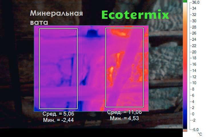 На фото снизу приведены температуры на поверхности двух утеплителей : минераловатного и бесшовного утеплителя экотермикс600. Температуры на поверхностях материалов значительно отличаются. Минеральная вата значительно хуже удерживает тепло в помещении, свободно пропуская его на улицу.